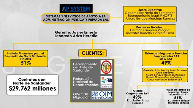 Los otros dos clientes de AP System son: La Federación Nacional de Departamentos, cuyo director es el exgobernador de Norte de Santander, Didier Tavera, y la OIM ONU Migración.
