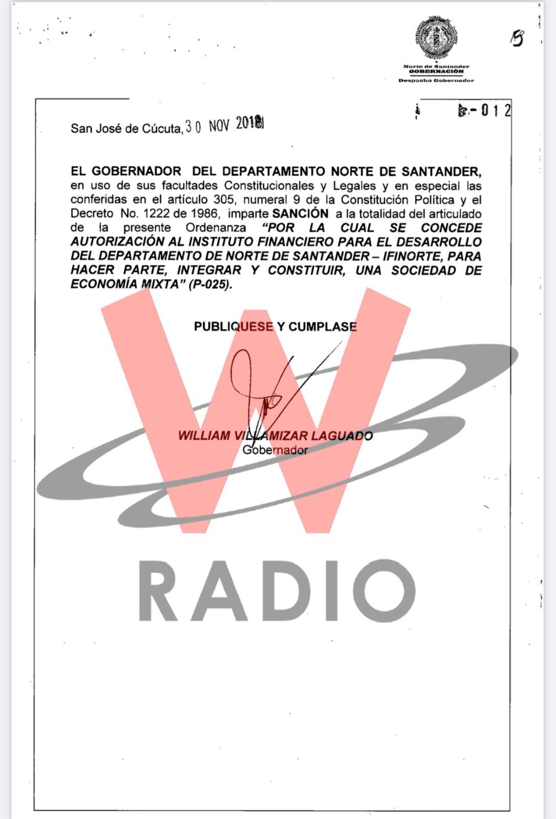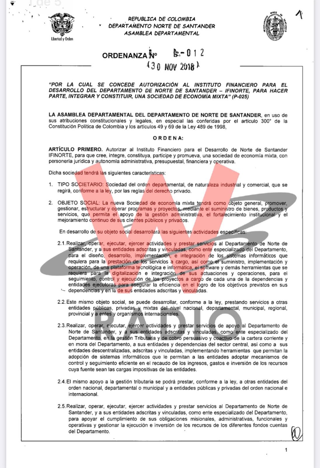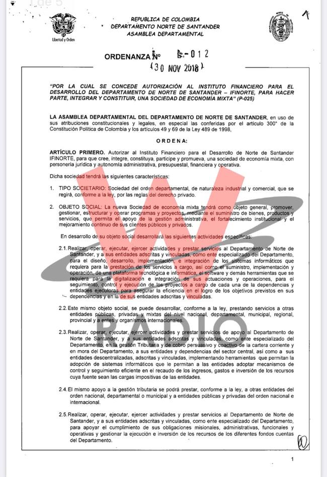 Mediante la Ordenanza 012 del 30 de noviembre de 2018 la Asamblea de Norte de Santander, con la firma del entonces gobernador, William Villamizar, se dio luz verde para que el Instituto Financiero para el Desarrollo del Departamento de Norte de Santander (Infinorte) pudiera ser parte accionista de una empresa de economía mixta.
