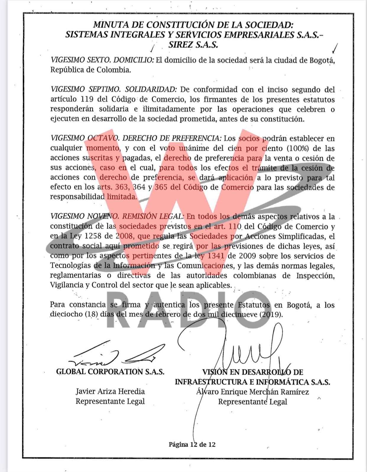 Global System SAS tenía como representante legal a Javier Ariza Heredia, quien a partir de ese momento fue clave en la formación de la empresa, mientras que Visión en Desarrollo de Infraestructura e Informática SAS tenía como representante legal a Álvaro Enrique Merchán Ramírez.