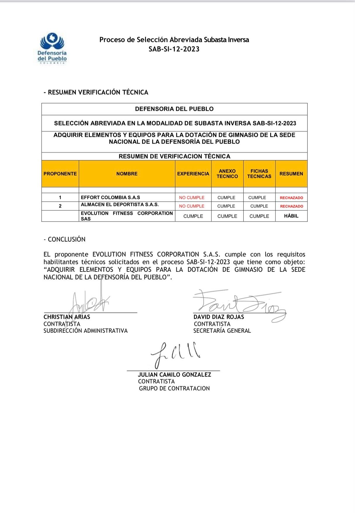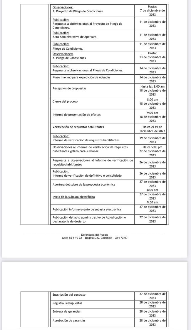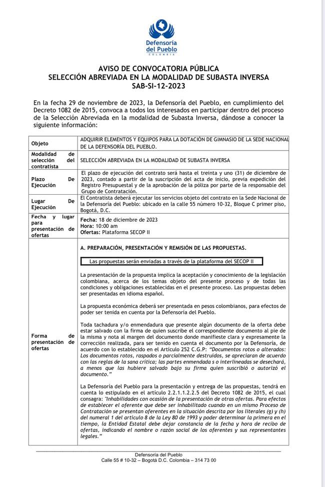 El 29 de noviembre de 2023, la Defensoría del Pueblo, convocó a todos los interesados en participar dentro del proceso de la Selección Abreviada en la modalidad de Subasta Inversa.