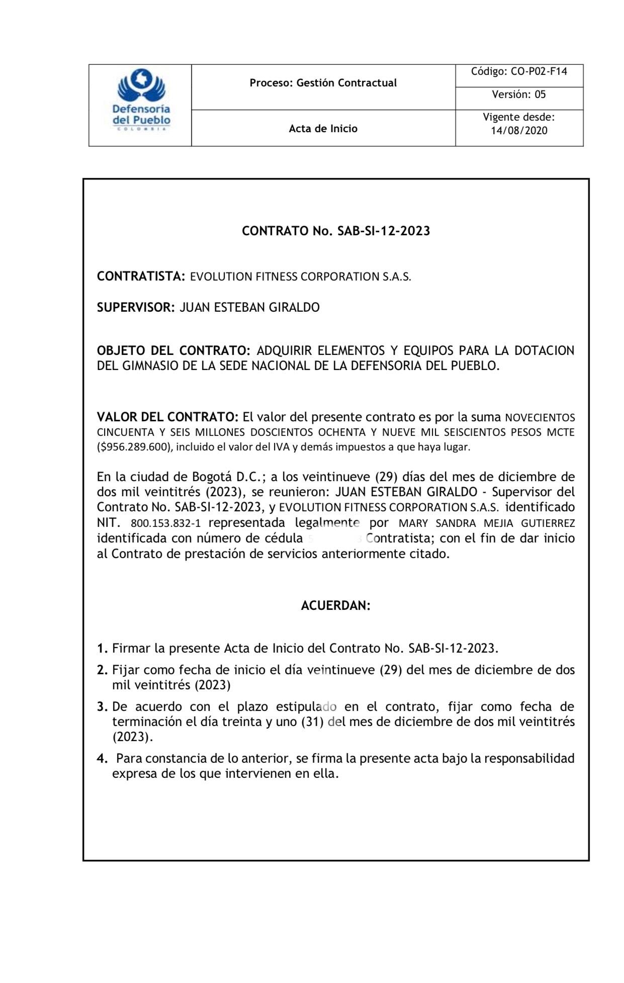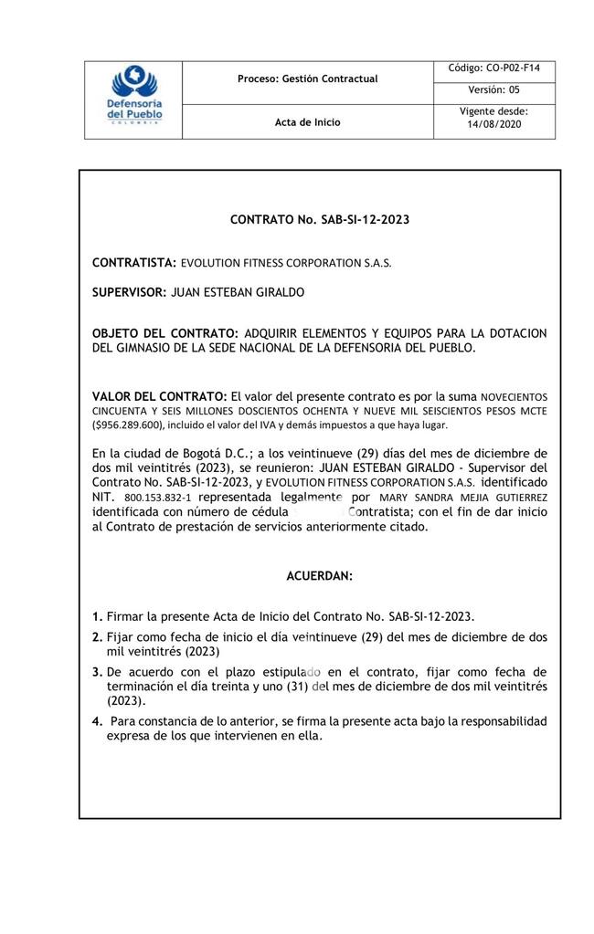 Contrato de dotación del gimnasio de la Defensoría del Pueblo.
