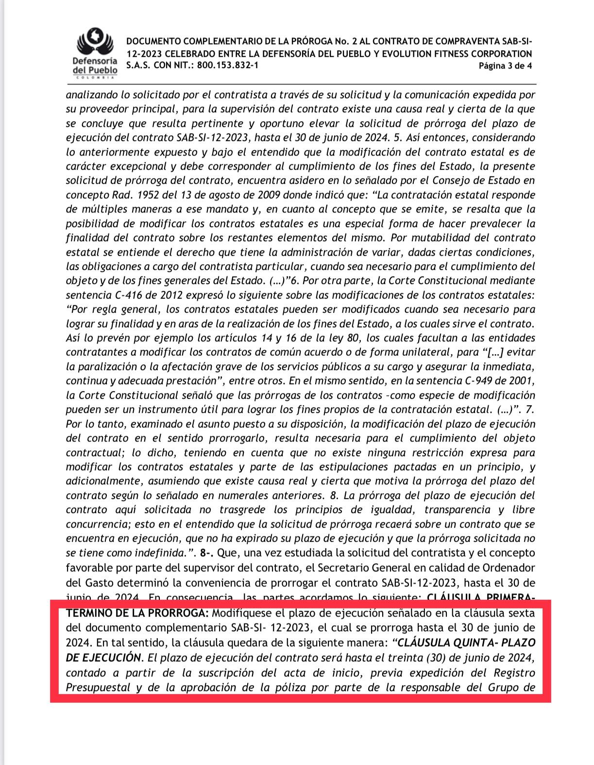 Esto fue considerado como un evento de fuerza mayor no atribuible a Evolution como contratista, “por lo que para evitar cualquier acción tendiente a la paralización del contrato referenciado se hace imperativo prorrogar por un término de 45 días calendario adicionales al plazo de ejecución ya establecido, es decir hasta el 13 de febrero de 2024 con la finalidad de entregar los equipos faltantes garantizando la idoneidad y calidad de los mismos”.