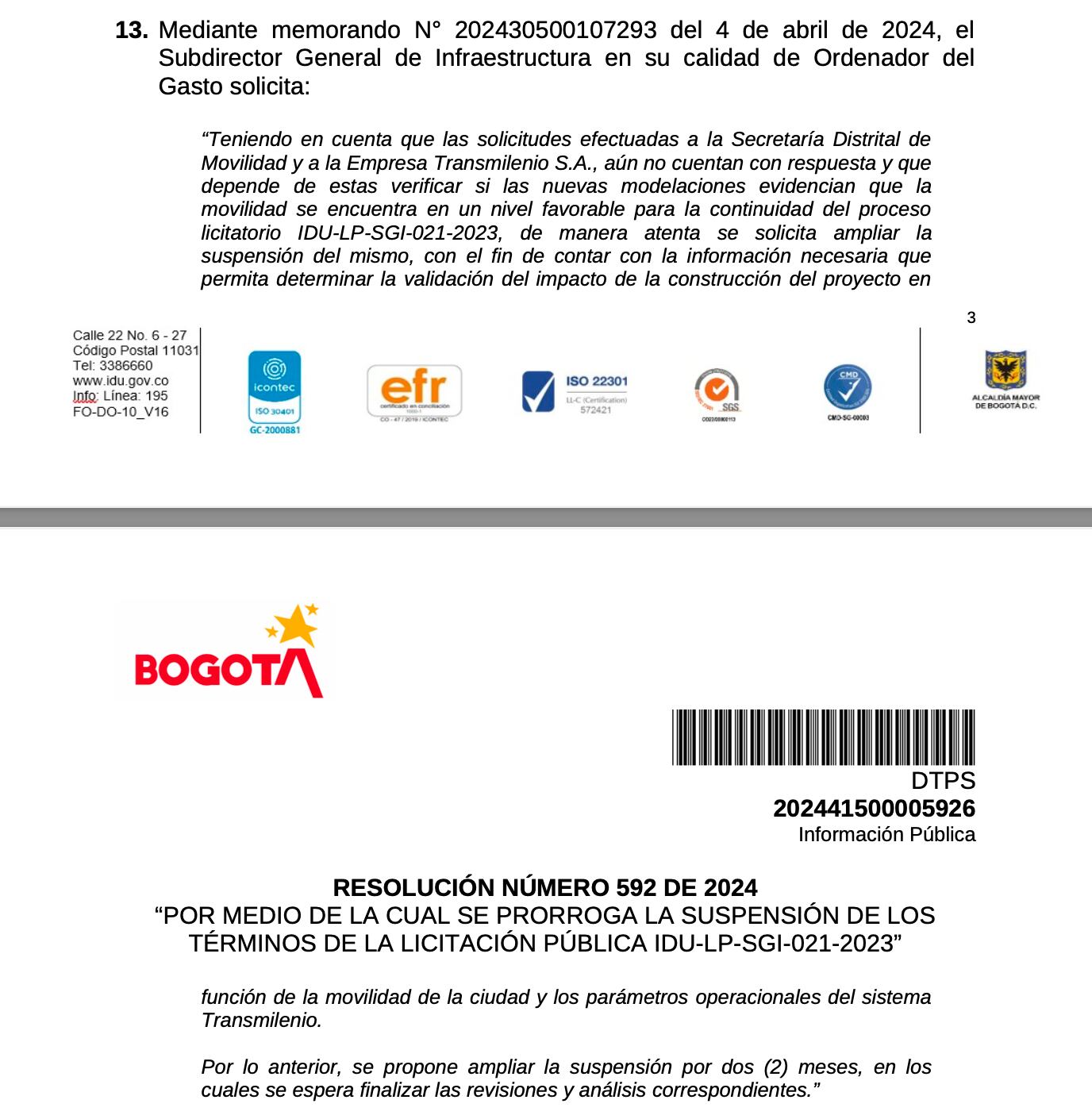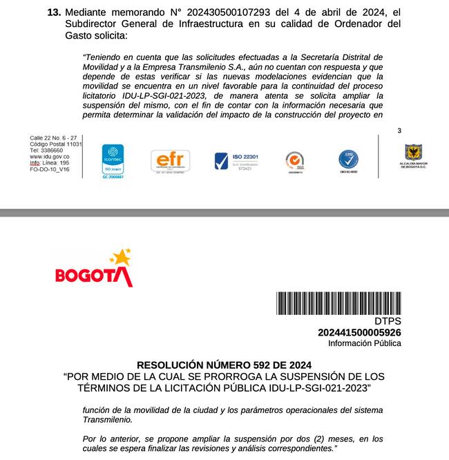 “Teniendo en cuenta que las solicitudes efectuadas a la Secretaría Distrital de Movilidad y a la Empresa Transmilenio S.A., aún no cuentan con respuesta y que depende de estas verificar si las nuevas modelaciones evidencian que la movilidad se encuentra en un nivel favorable para la continuidad del proceso licitatorio IDU-LP-SGI-021-2023, de manera atenta se solicita ampliar la suspensión del mismo, con el fin de contar con la información necesaria que permita determinar la validación del impacto de la construcción del proyecto en función de la movilidad de la ciudad y los parámetros operacionales del sistema Transmilenio.”