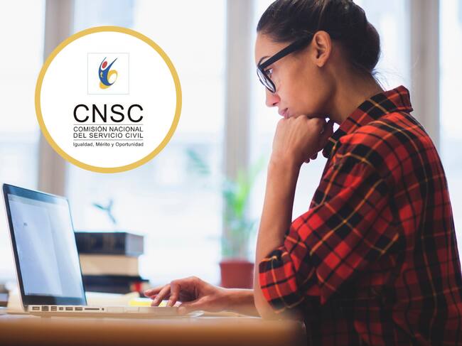 Mujer usando su computador para hacer consultas. En el círculo, el logo de la Comisión Nacional del Servicio Civil (Fotos vía GettyImages y redes sociales)