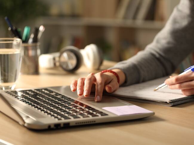 Close up of student girl hands comparing notes on laptop sitting on a desk at home at night / Pheelings Media