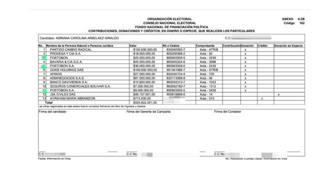 En similar situación está la representante a la Cámara Adriana Carolina Arbeláez, quien votó para aplazar la entrada en vigor de los impuestos saludables, a pesar de haber recibido tres aportes de Postobón que suman 70 millones de pesos y uno de Bavaria por 45 millones de pesos. Es decir 115 millones de pesos de aportes para su elección de parte de empresas interesadas en la suerte de esta iniciativa.