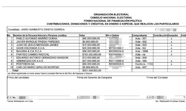 Donaciones representante a la Cámara Jairo Humberto Cristo Correa