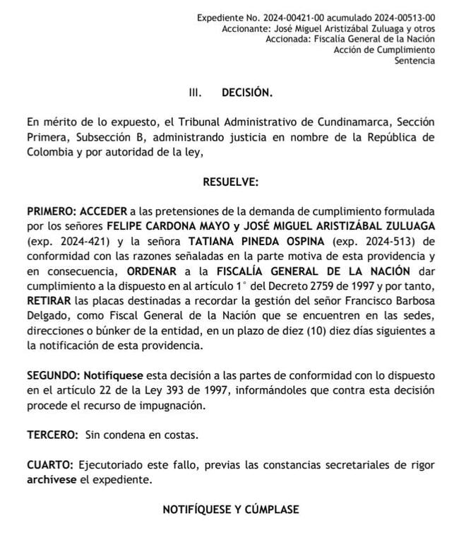 “Acceder a las pretensiones de la demanda de cumplimiento formulada por los señores Felipe Cardona Mayo, José Miguel Aristizábal y la señora Tatiana Pineda Ospina de conformidad con las razones señaladas en la parte motiva de esta providencia de ordenar a la Fiscalía de retirar las placas destinadas a recordar la gestión del señor Francisco Barbosa”, señala el fallo.