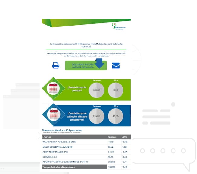 - Habiendo ingresado podrá consultar su historia laboral al detalle: tiempo cotizado, tiempo que le falta para pensionarse e incluso las semanas que ha cotizado en las diferentes empresas en las que ha estado.