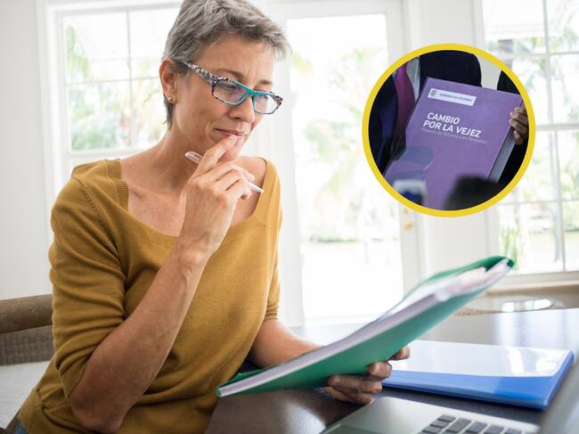 Mujer a punto de recibir su pensión revisando diferentes documentos. En el círculo, el libro de la reforma pensional presentada por el Gobierno Petro (Fotos vía GettyImages y Colprensa)