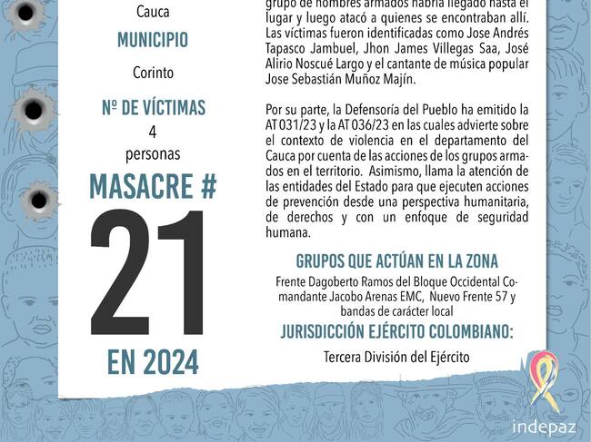Según Indepaz, con estos asesinatos ya son tres las masacres ocurridas en el departamento del Cauca en lo que va del 2024 y 21 en todo el territorio nacional.