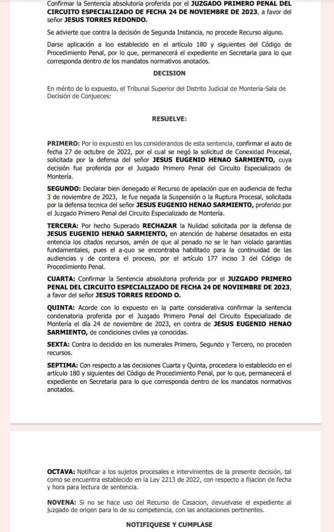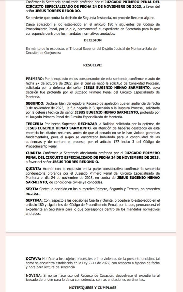 “Acorde con lo expuesto, se confirmará la sentencia condenatoria proferida por el Juzgado Primero Penal del Circuito Especializado de Montería el día 24 de noviembre de 2023, en contra de JESÚS EUGENIO HENAO SARMIENTO, de condiciones civiles ya conocidas. Así mismo, se confirmará el auto de fecha 27 de octubre de 2022, por el cual se negó la solicitud de conexidad procesal, cuya decisión fue proferida por el Juzgado Primero Penal del Circuito Especializado de Montería”, se precisa en la sentencia.