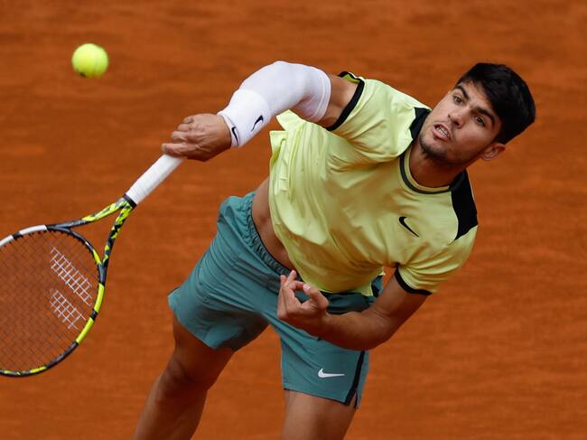 -FOTODELDÍA- MADRID, 30/04/2024.- El tenista español Carlos Alcaraz sirve la bola al alemán Jan-Lennard Struff, durante su partido de octavos de final del Mutua Madrid Open disputado este martes en las instalaciones de la Caja Mágica. EFE/JuanJo Martín / JuanJo Martín (EFE)