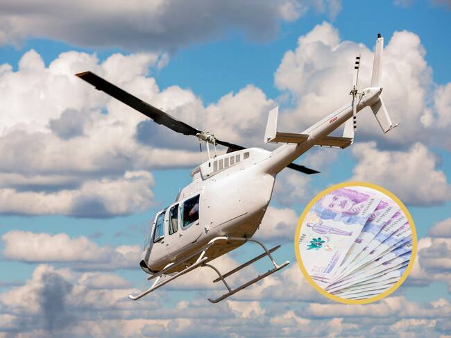 Helicóptero volando en un cielo azul con nubes. En el círculo, billetes de 50 mil pesos colombianos (GettyImages)