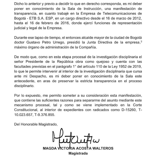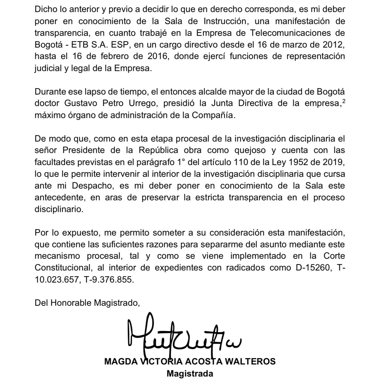 También conocimos que la magistrada ponente Magda Victoria Acosta se aparta de la investigación disciplinaria contra el fiscal Burgos porque trabajó en la Empresa de Telecomunicaciones de Bogotá - ETB S.A. ESP, en un cargo directivo desde el 16 de marzo de 2012, hasta el 16 de febrero de 2016, donde representó a la Empresa. Sin embargo, durante ese lapso de tiempo, el entonces alcalde mayor de Bogotá Gustavo Petro Urrego presidió la Junta Directiva de la empresa “máximo órgano de administración de la Compañía”.