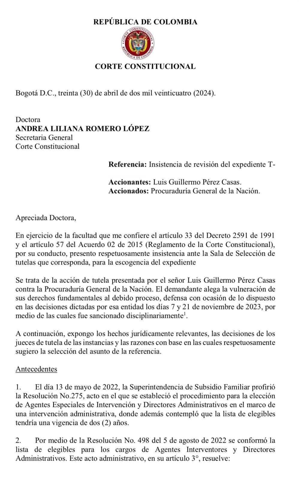 Los magistrados Juan Carlos Cortés y Vladimir Fernández, elevaron una solicitud de insistencia, por medio de la cual le pidieron a la sala plena de la Corte Constitucional que seleccione una tutela presentada por el ahora sancionado superintendente del subsidio familiar Luis Guillermo Pérez, con la que pretendía tumbar la suspensión provisional que tenía por seis meses, también dictada por la Procuraduría.