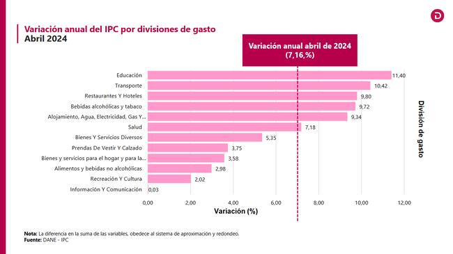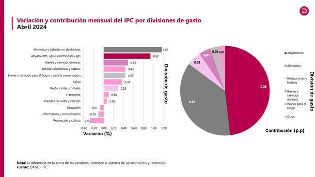 En cuanto a las divisiones de gasto que ayudaron a que la inflación en esta medición bajara para abril, se encontraron: información y comunicación; recreación y cultura; alimentación y bebidas no alcohólicas.