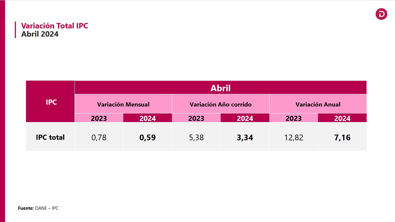 Según el más reciente informe del Departamento Administrativo Nacional de Estadística, DANE, la inflación en Colombia volvió a bajar y para el cuarto mes del año en su medición anual llegó al 7,16%, cifra inferior a la que se registró en el mismo periodo de 2023 cuando alcanzó el 12,82%.