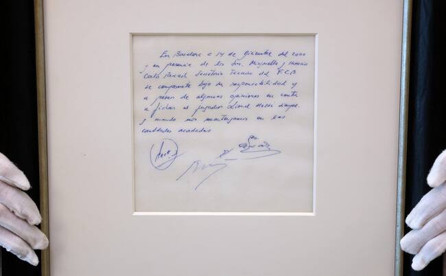 El papel, que data de diciembre del 2000, cuando Messi tenía apenas trece años, supone el compromiso de un contrato con el Barcelona y estaba firmada en bolígrafo azul por Carles Rexach, por entonces director deportivo de los ‘Blaugrana’.