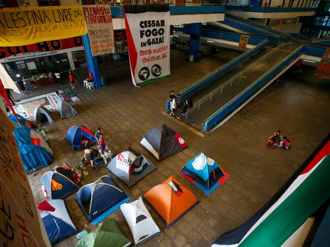 Rodeados de pancartas con mensajes como “Palestina Libre”, “Cese al fuego ya” y tiendas de campaña con banderas palestinas, Noah Silva, uno de los participantes, explicó a EFE que quieren servir de ejemplo para que el movimiento “se expanda a otras universidades de Brasil”.