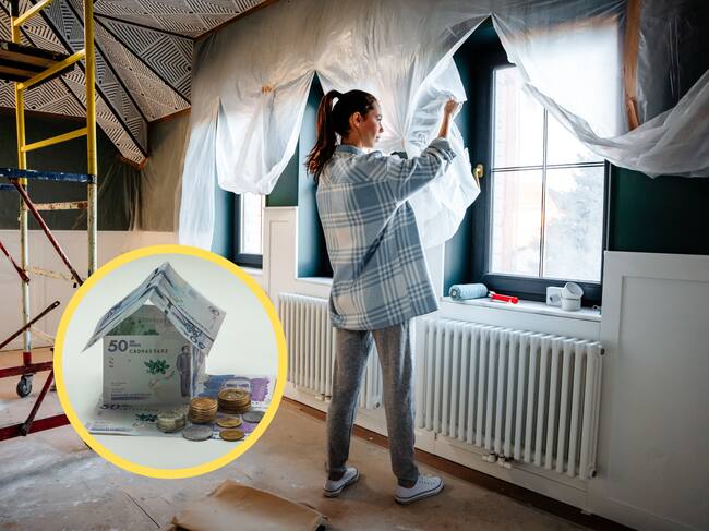 Mujer haciendo arreglos en su vivienda. En el círculo, billetes colombianos formando una casa (GettyImages)
