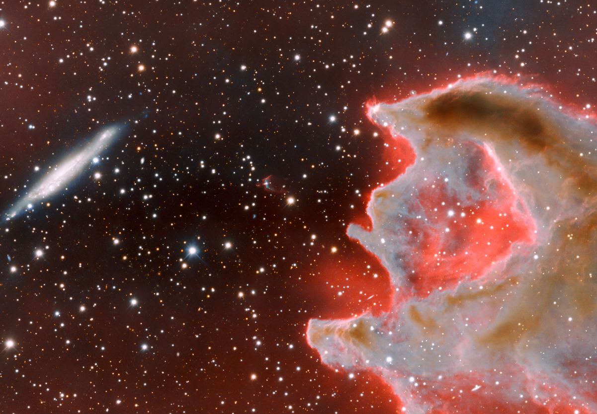 La galaxia espiral que el CG4 parece estar alcanzando se llama ESO 257-19, y en realidad está a más de cien millones de años luz de la supuesta mano, como explican los astrónomos.