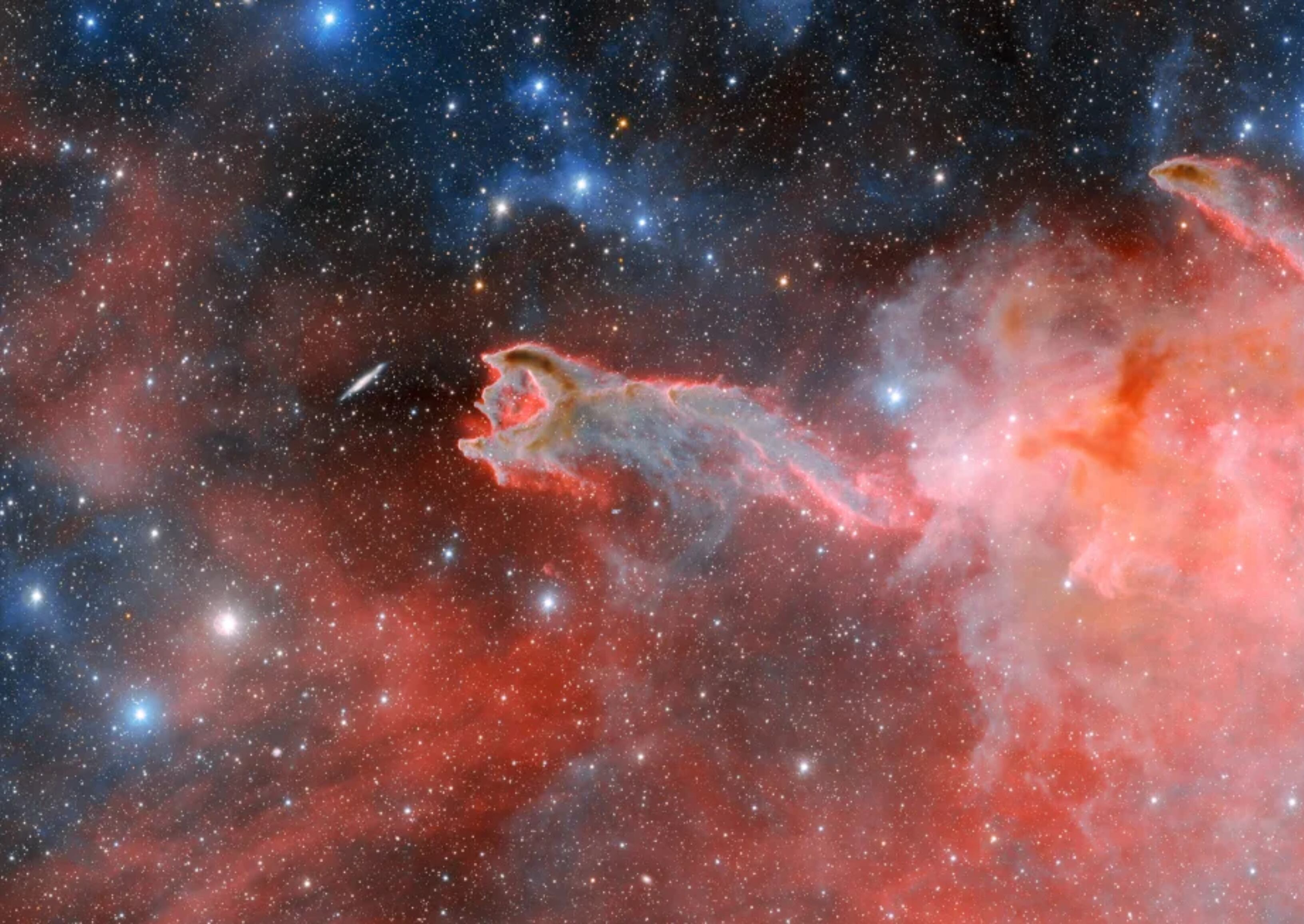 Alrededor de mil años luz de distancia de la Tierra, entre estrellas y galaxias, se pudo apreciar una mano en tonalidades rosas nubosas con un llamativo resplandor, conocida con el nombre de CG4.