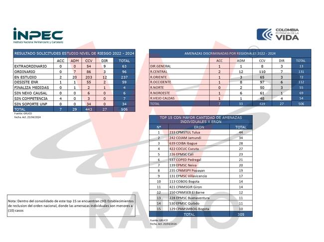 W Radio también conoció el ranking de las cárceles en las que hay más amenazas contra directores y guardianes del Inpec.