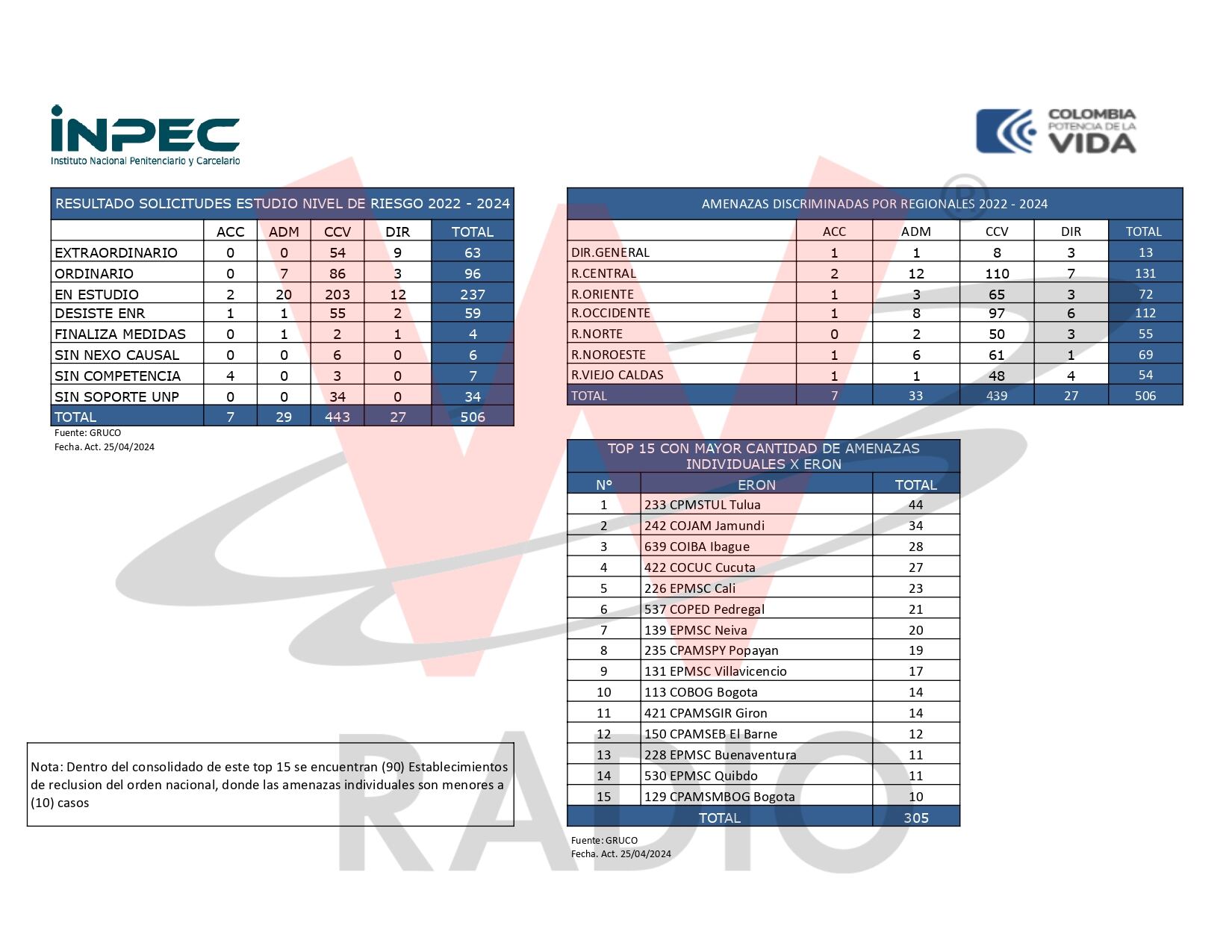 W Radio también conoció el ranking de las cárceles en las que hay más amenazas contra directores y guardianes del Inpec.