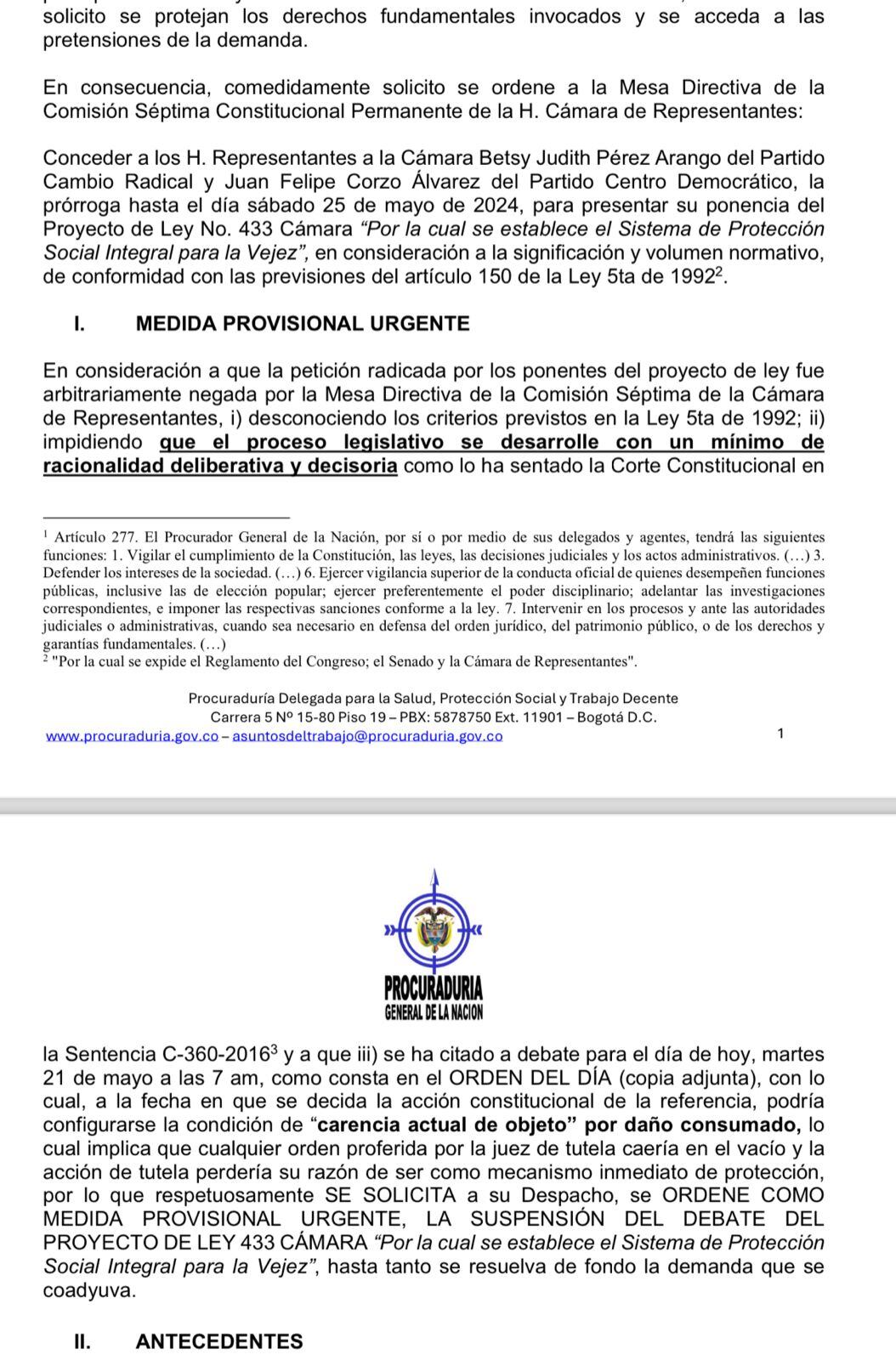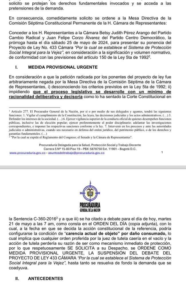 La Procuraduría General de la Nación, por medio de una tutela, pidió que se suspenda y aplace la discusión de la reforma pensional que se adelanta en la Comisión Séptima de la Cámara de Representantes hasta que la oposición presente una ponencia sobre el proyecto.
