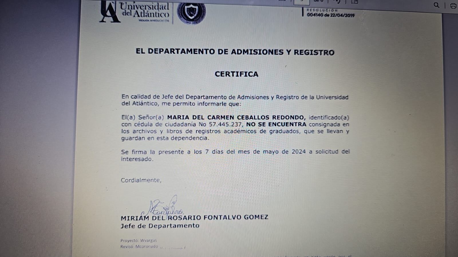 La Universidad del Atlántico, a través del Departamento de Admisiones y Registro, certificó que Ceballos Redondo, no se encuentra consignada en los archivos y libros de registros académicos de graduados que se llevan y guardan en esa dependencia.