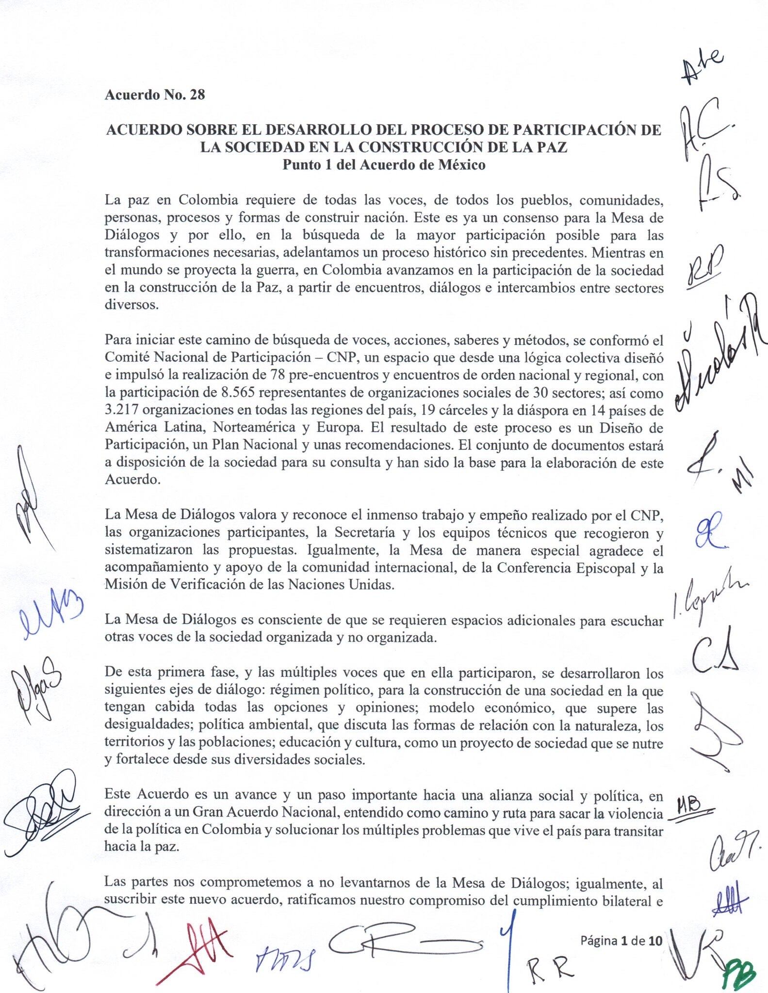 Beltrán también recordó que hace 18 meses comenzaron en Caracas las conversaciones de paz y que este punto que firmaron es el número uno de la agenda de seis puntos acordada en México y el acuerdo 28 desde que iniciaron los diálogos.