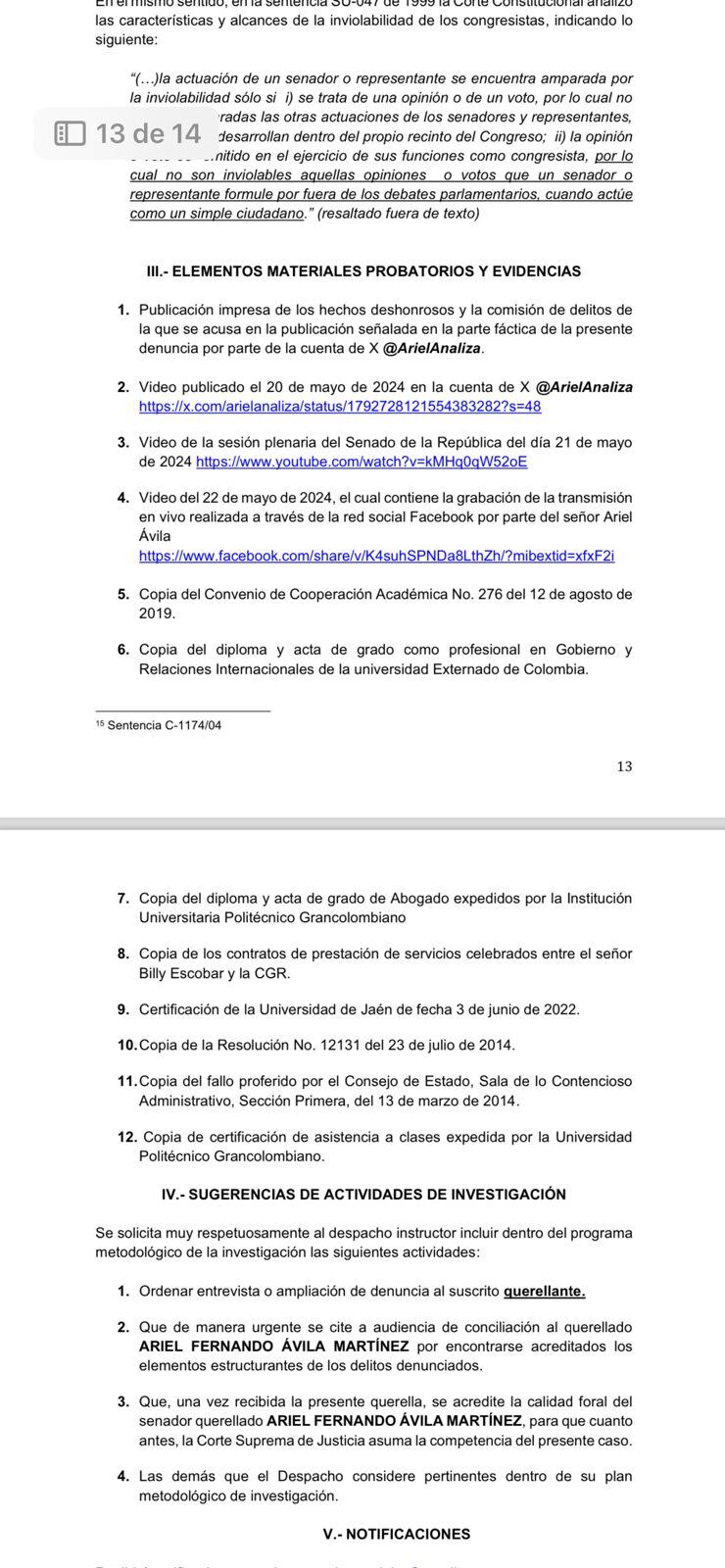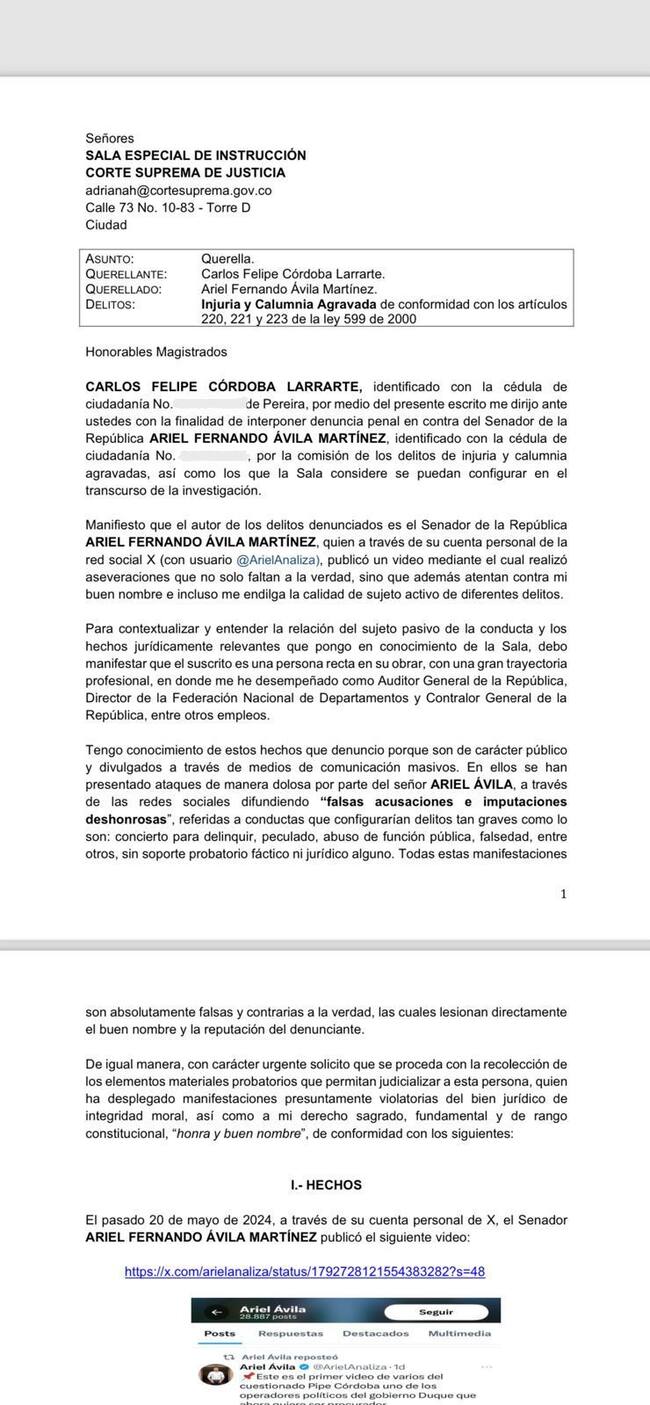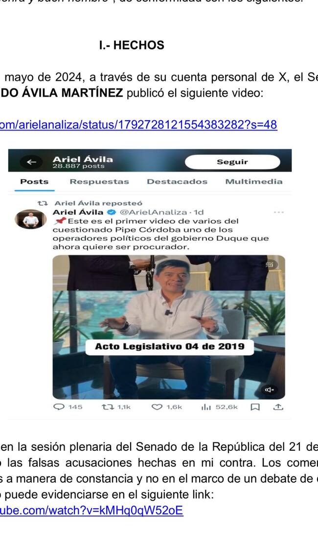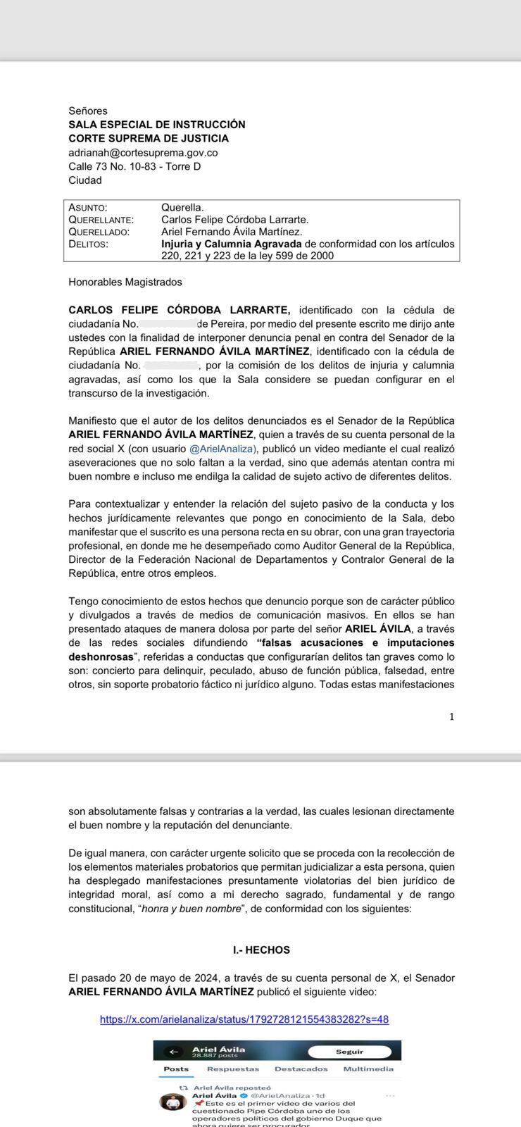 La querella de Córdoba alega que Ariel Ávila publicó un video desde su cuenta de X, en el cual “realizó aseveraciones que no solo faltan a la verdad, sino que además atentan contra mi buen nombre e incluso me endilga la calidad de sujeto delictivo en diferentes delitos”.