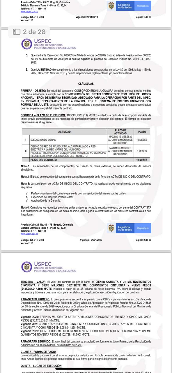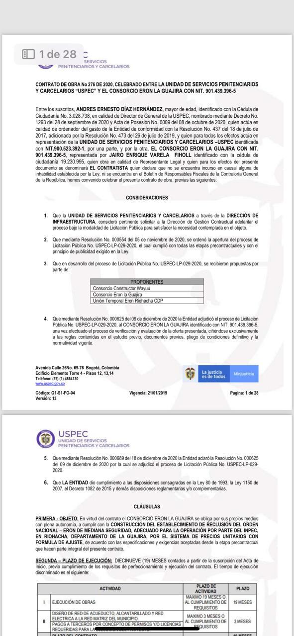 Resulta que desde 2020 se firmó un contrato de obra entre la Uspec y el consorcio ERON en La Guajira, pero la obra tenía una promesa para ser construida máximo en 19 meses y se pactó con un costo de 181.000 millones de pesos, lleva tres años desde la construcción, cuatro años desde la firma del proyecto, y según las comunidades, todavía se encuentra en etapa inicial.