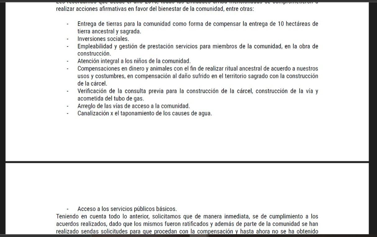 Por otra parte, los Walinay, dijeron que el gobierno y las autoridades locales, como la gobernación y la alcaldía no cumplieron con lo pactado para la entrega de las 10 hectáreas donde se construiría la cárcel y por eso detuvieron la obra.