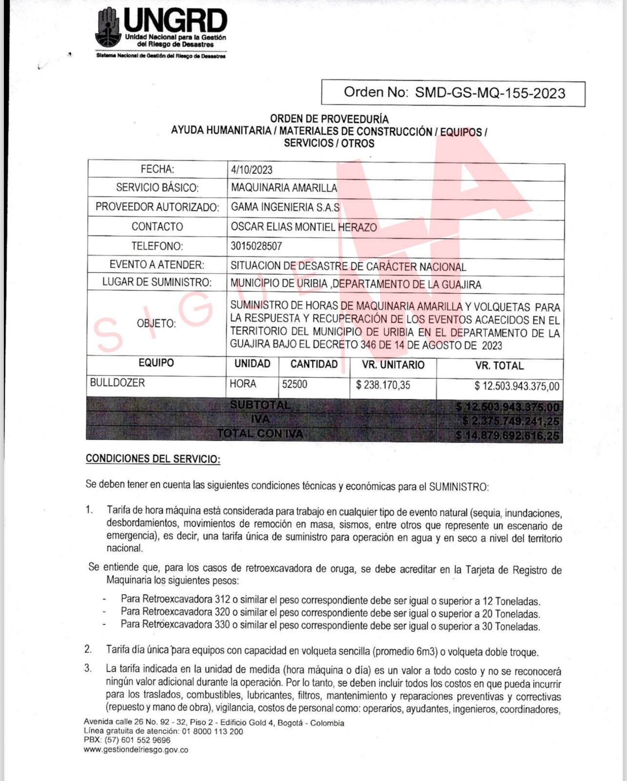 El contrato más cuantioso de maquinaria amarilla fue entregado también a Uribia por 14.800 millones de pesos y, según la orden de proveeduría conocida por Sigue La W, tenía como finalidad el alquiler de un bulldozer. Este fue adjudicado al proveedor GAMA INGENIERIA SAS y fue solicitado explícitamente por Sneyder Pinilla, exdirector de desastres y confeso culpable.