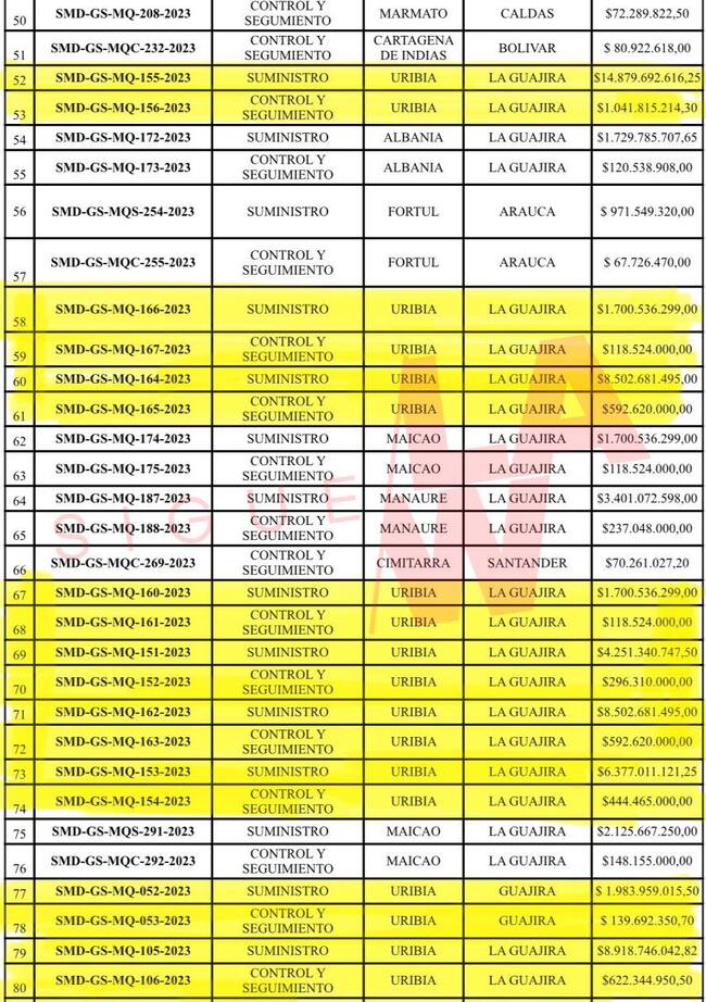 Sigue La W conoció en exclusiva los 216 contratos de maquinaria amarilla que entregaron a dedo Olmedo López y Sneyder Pinilla por más de 200 mil millones de pesos. Llama poderosamente la atención que el 35.7% de los contratos fueron destinados al municipio de Uribia en La Guajira, con un valor total de 76 mil millones de pesos.