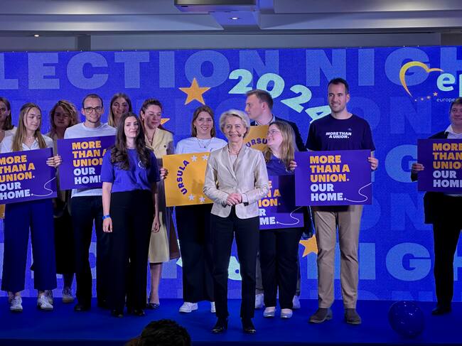 La presidenta de la Comisión Europea y candidata del Partido Popular Europeo (PPE) a repetir en el cargo, la alemana Ursula von der Leyen (c), celebra los resultados de las elecciones europeas. EFE/Laura P. Gutiérrez