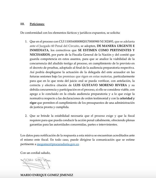 El documento de cuatro páginas, firmado por el procurador judicial Mario Enrique Gómez, precisa que, las últimas audiencias del juicio oral no se han podido adelantar porque Moreno, testigo de la Fiscalía General de la Nación, ha expresado que: “sólo lo hará cuando se defina que se encuentra vigente y a su favor el principio de oportunidad que debe ser renovado para que pueda continuar atendiendo las exigencias del proceso”, dice el documento.