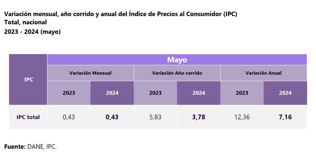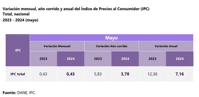 Según el más reciente informe del Dane, la inflación en su medición anual en Colombia para mayo se ubicó en 7,16%, manteniendo así la moderación que ha mostrado en los recientes meses, allí la directora de la entidad estadística, Piedad Urdinola, expresó “esta tendencia sigue a la baja, 7,16% sigue estando en positivo, sigue siendo una cifra que no veíamos desde enero de 2022 cuando reportamos 6,94%”. Se debe tener en cuenta que la cifra de mayo fue la misma que se registró para abril de este mismo año en su medición anual.