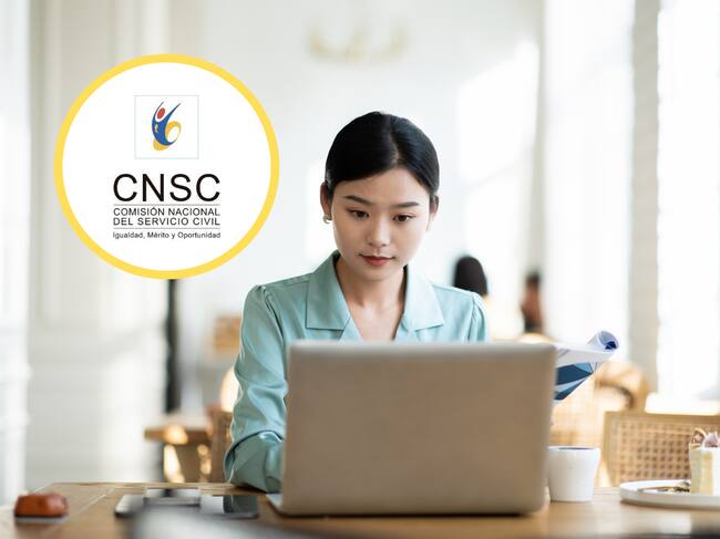 Japonesa usando su computador. Encima, logo de la Comisión Nacional del Servicio Civil (GettyImages / Redes sociales)