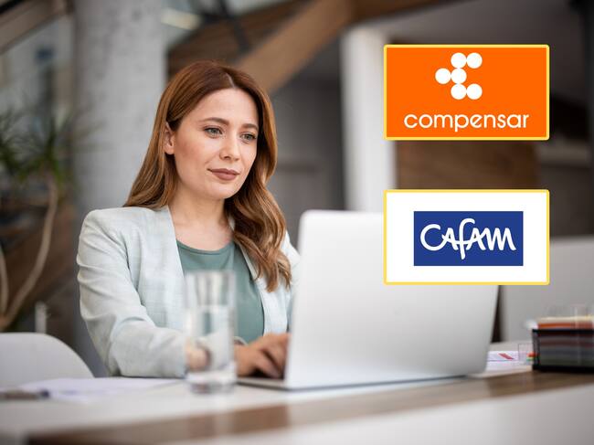 Mujer usando computador. Encima logos de las cajas de compensación Compensar y Cafam (GettyImages / Redes sociales)