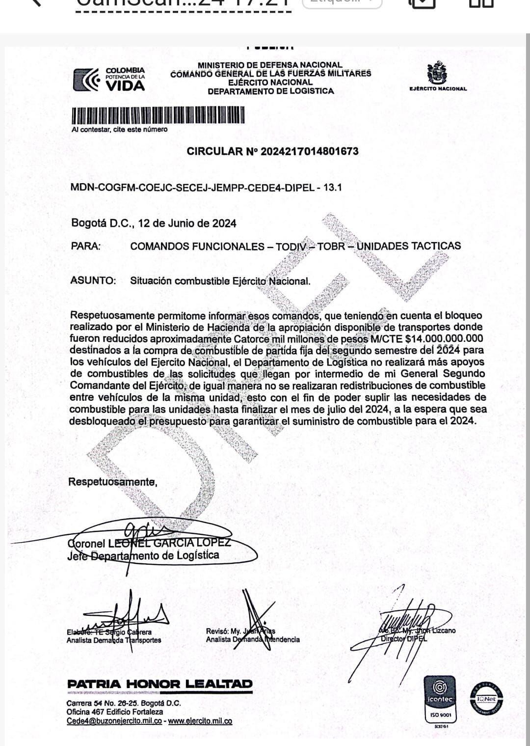En la noche de este miércoles, se conoció un documento firmado por Leonel García, comandante de Logística del Ejército Nacional, en el que se confirma el “bloqueo” del Ministerio de Hacienda de la apropiación disponible de transportes en donde fueron reducidos aproximadamente 14.000 millones de pesos destinados a la compra de combustible de partida fija del segundo semestre del 2024 para los vehículos del Ejército Nacional.