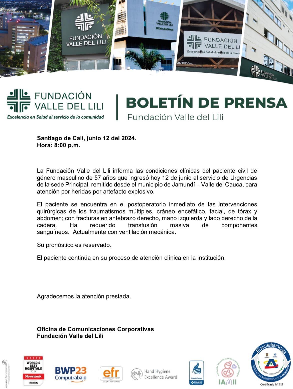 El paciente es atendido en la clínica Valle del Lili en Cali.