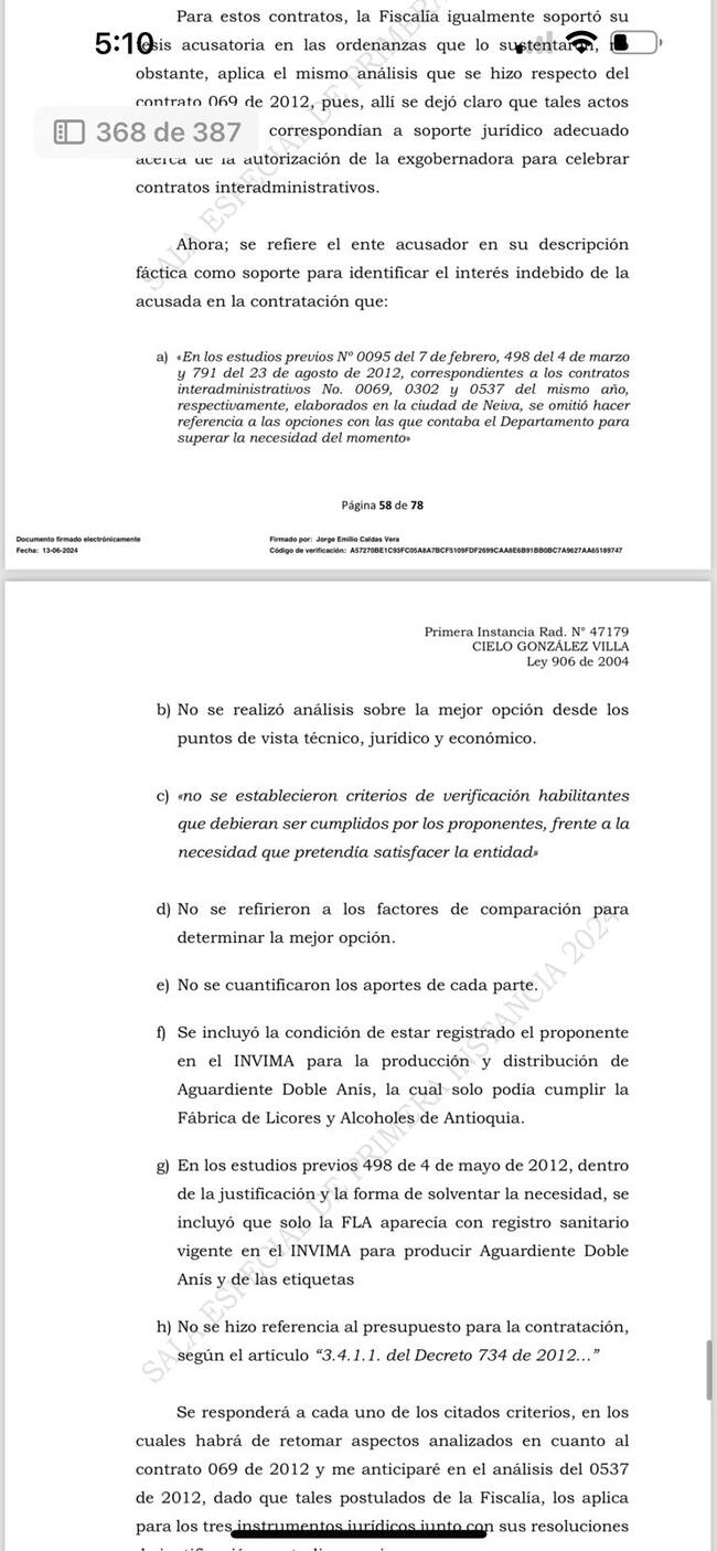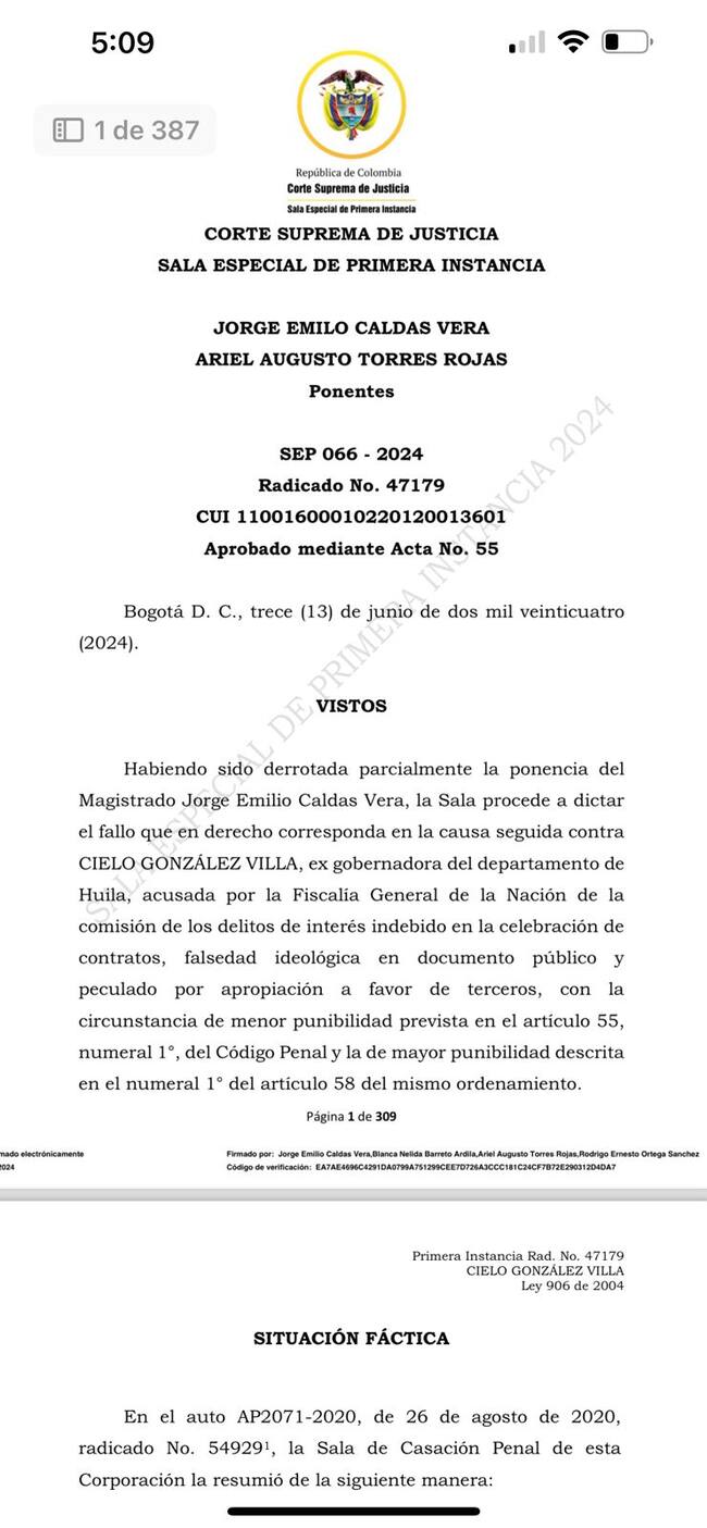 La Sala Especial de Primera Instancia de la Corte Suprema de Justicia leyó el fallo contra la exgobernadora del Huila, Cielo González, y la condenó a seis años y siete meses de prisión por irregularidades con el contrato de concesión para la explotación del aguardiente doble anís.
