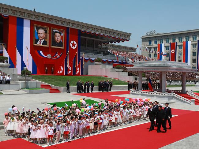 El encuentro vino precedido por una gran ceremonia para recibir a Putin en la icónica plaza Kim Il-sung de la capital norcoreana, engalanada con globos y miles de ciudadanos norcoreanos agitando las banderas de ambos países.