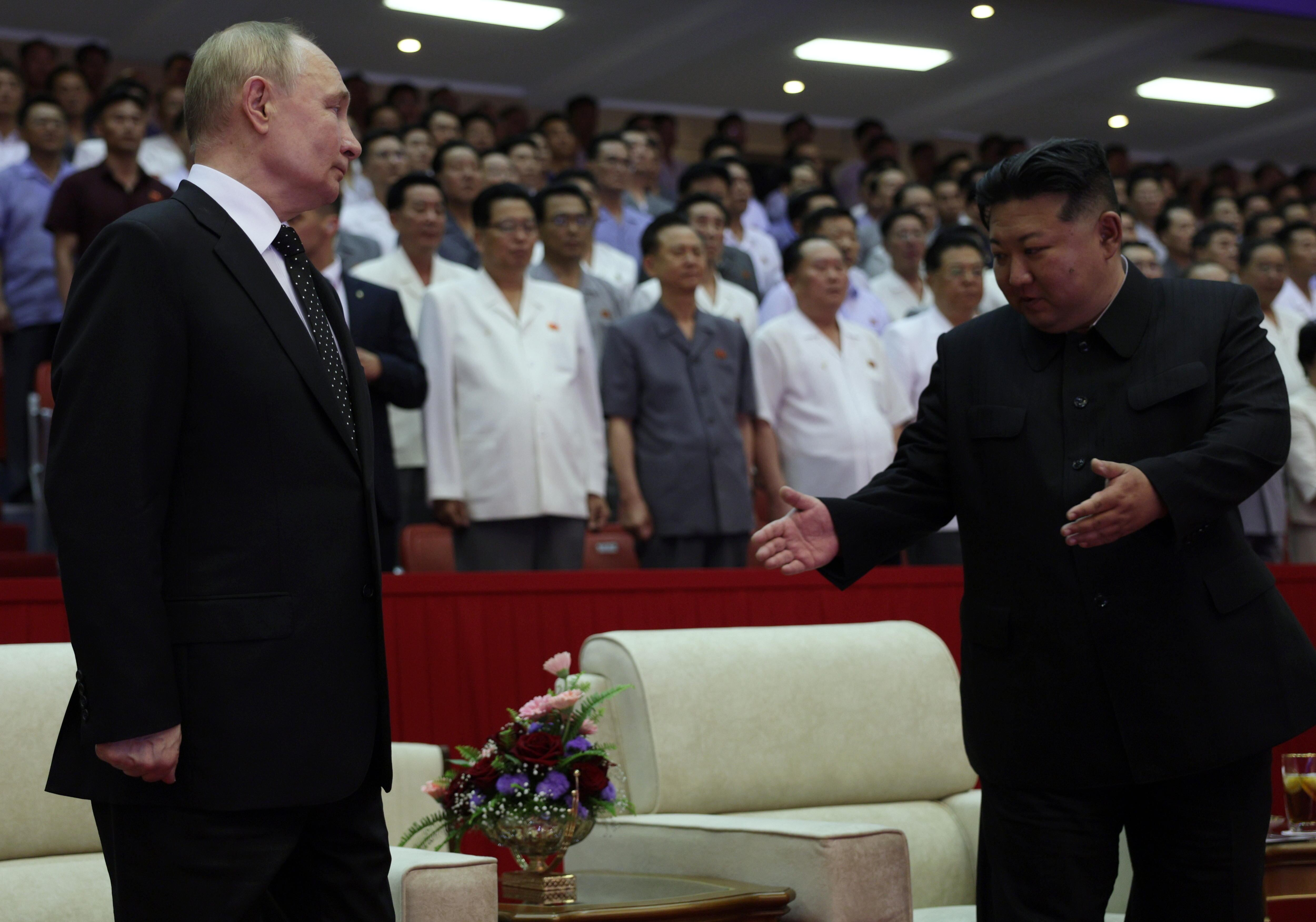 El encuentro vino precedido por una gran ceremonia para recibir a Putin en la icónica plaza Kim Il-sung de la capital norcoreana, engalanada con globos y miles de ciudadanos norcoreanos agitando las banderas de ambos países.