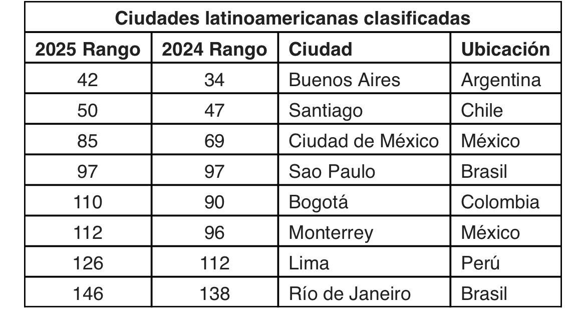 En los resultados figuran ocho ciudades latinoamericanas, siendo Buenos Aires la mejor situada de la región, con el puesto 42, ocho menos que el año anterior. Cuatro ciudades latinoamericanas figuran entre las 100 primeras del mundo.