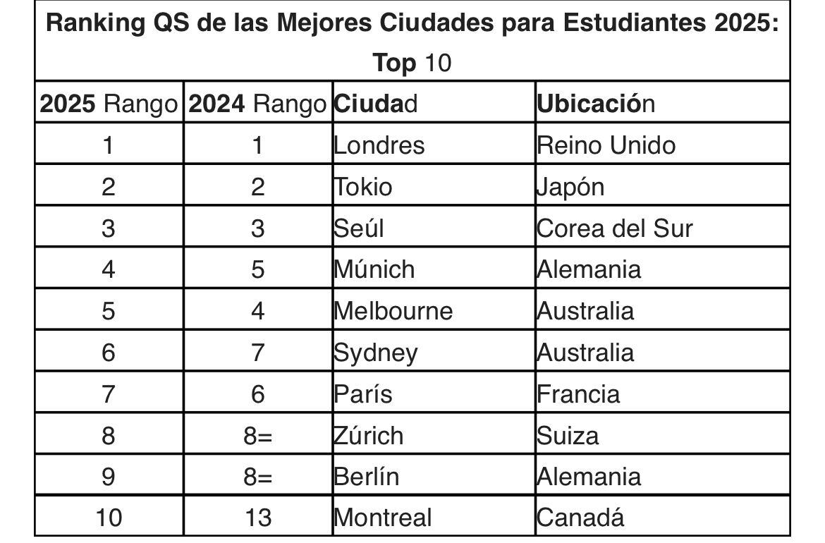 De acuerdo con este ranking, Londres sigue siendo la mejor ciudad estudiantil del mundo por sexta ocasión consecutiva, seguida de Tokio, Seúl, Múnich y Melbourne.