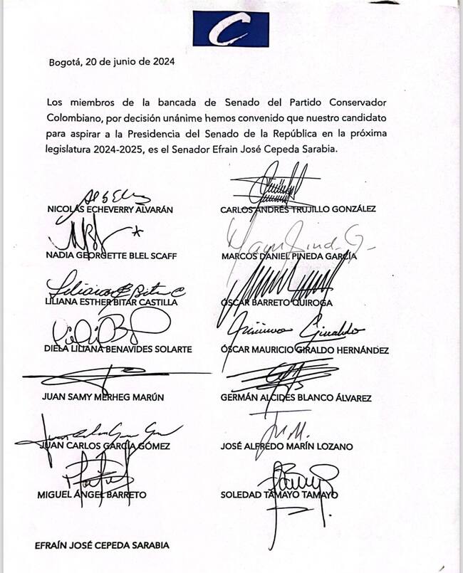 La bancada de senadores del Partido Conservador decidió, de forma unánime, postular a Efraín Cepeda como su candidato a la Presidencia del Senado de la República para la legislatura que inicia el 20 de julio.
